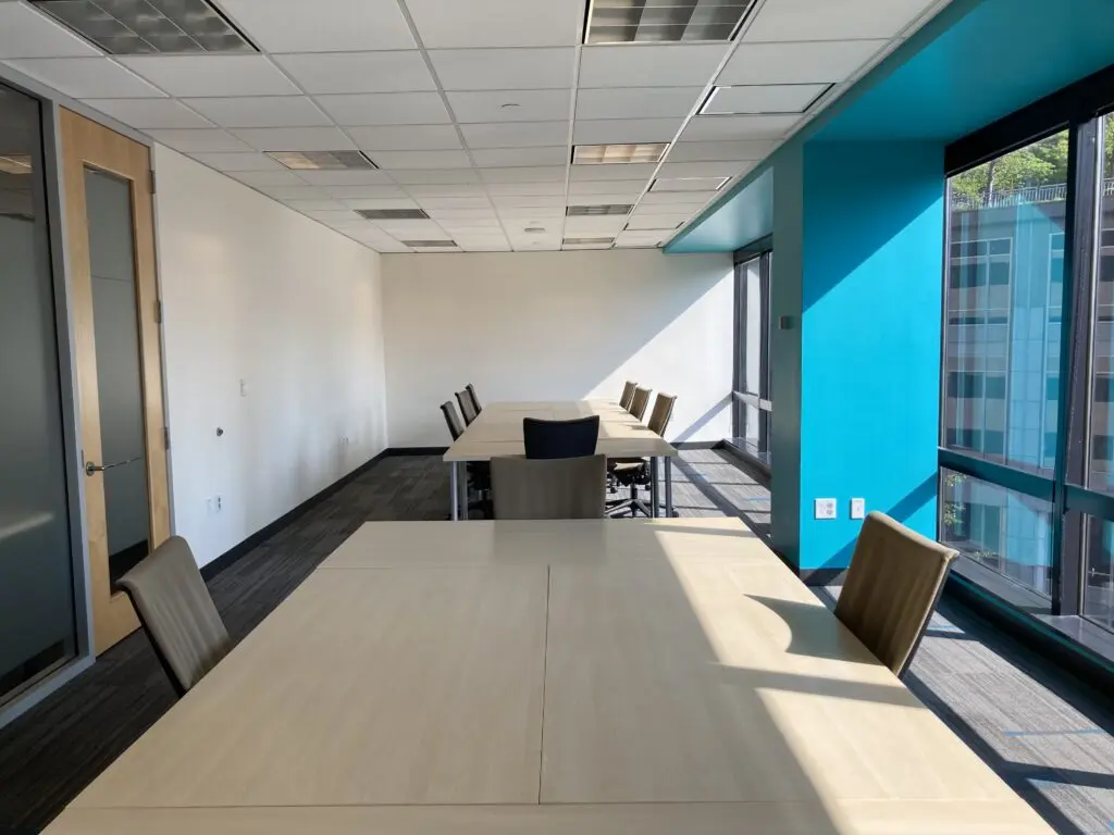 The space features a conference table, whiteboard, and configurable layout with natural sunlight from full-length Eastern windows. Perfect for multi-day sprints, SCRUM work, workshops, and team collaborations.