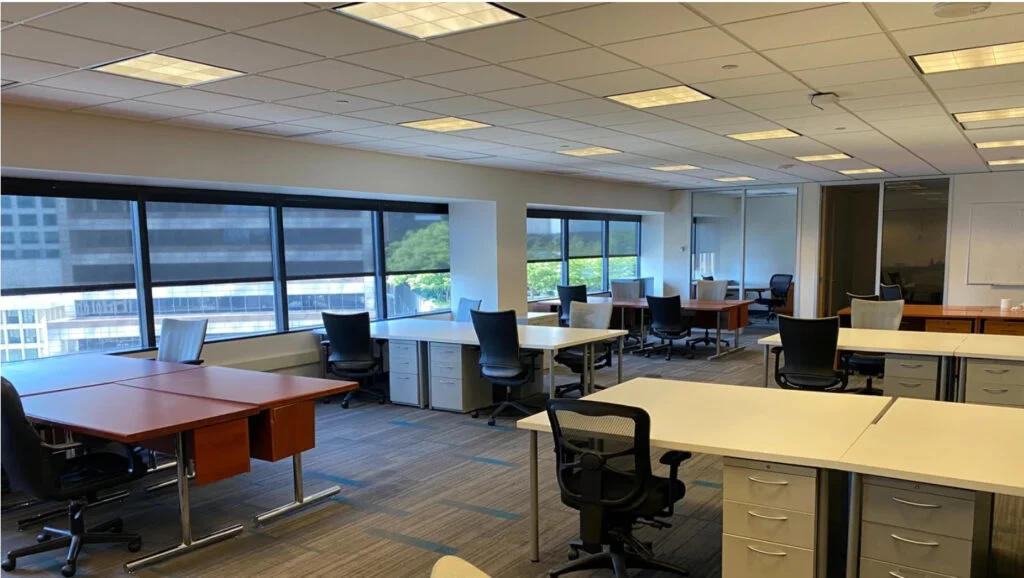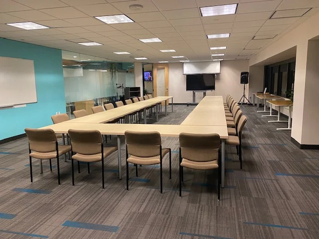 A spacious meeting room that accommodates up to 40 individuals. Designed with your comfort and productivity in mind, this room offers comfortable seating, abundant natural light, and captivating city views.